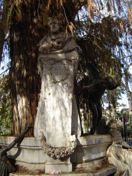 En el parque de María Luisa de Sevilla hay un monumento a uno de los escritores más ilustres de la ciudad: Gustavo Adolfo "Bécquer", que aunque reconozco que su Poesía en general ya me resulta bastante almibarada tiene algunos aciertos, y no se le puede negar el valor que ha tenido en el desarrollo de la literatura española, aparte de que me gustan sus Leyendas y me encantan las "Cartas literarias a una mujer"; el monumento, obra del escultor Lorenzo Coullaut Varela, fue inaugurado el 9 de Diciembre de 1911, y al lado del busto del poeta se encuentran tres figuras feméninas que representan el amor ilusionado, el amor poseido y el amor perdido, además de dos figuras de bronce que simbolizan el amor que hiere y el amor herido.